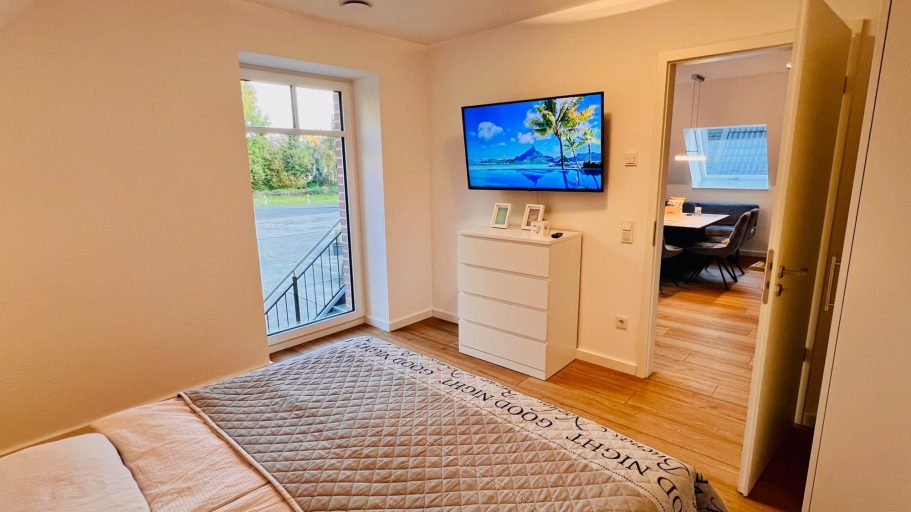 Schlafzimmer 2 ist mit einem motorisch verstellbaren Bett mit Tellerfedernlattenrosten mit verschiedenen Zonen und hochwertigen Taschenfederkernmatratzen ausgestattet.